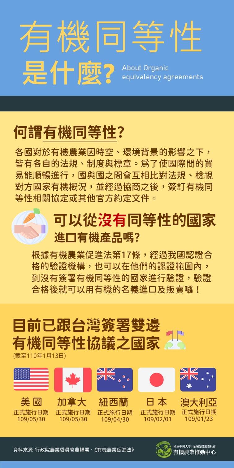 歷時超過2年的有機法規比對及協商,113年5月22日農業部與英國簽署臺英有機產品相互承認瞭解備忘錄,完成有機同等性相互承認,成為我國第一個歐洲地區雙邊有機同等性國家。
